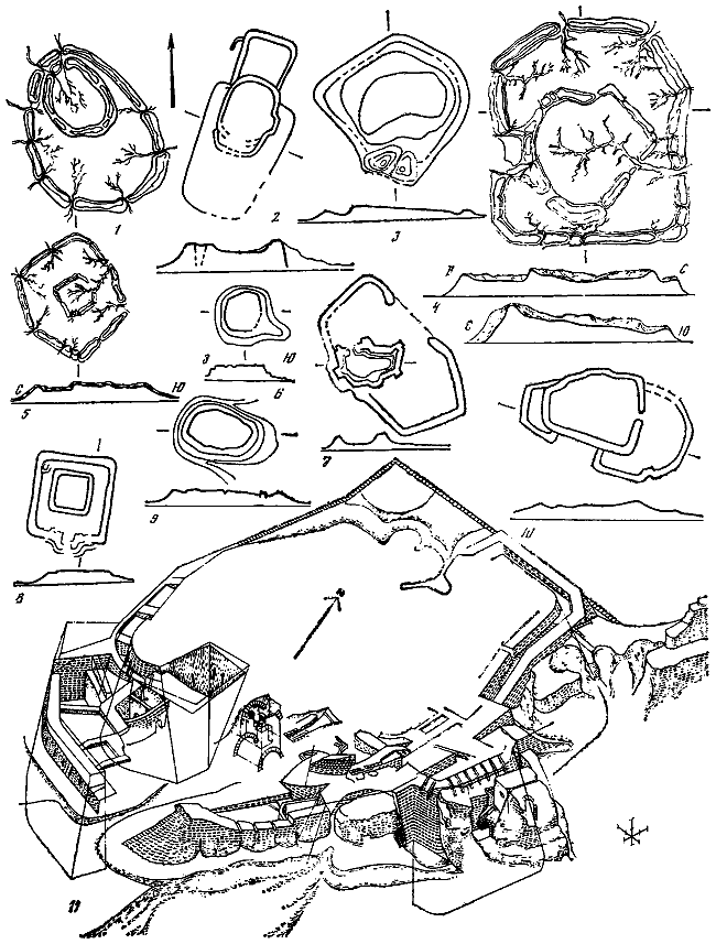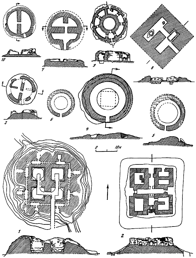 Таблица 15. Джетыасарская культура. Городища этапа Джеты-асар I. Планы и разрезы.