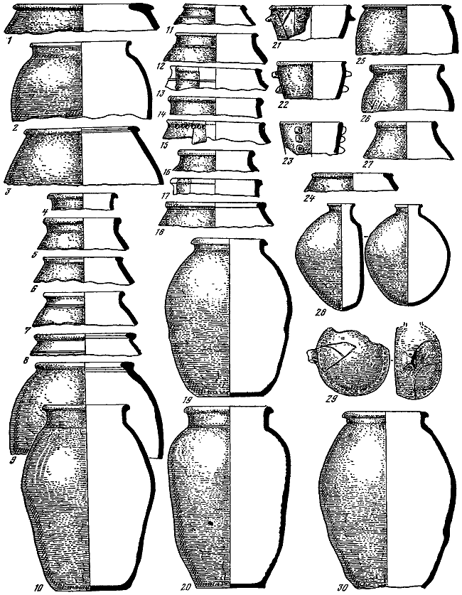 1–9, 11–30 – глина (7 – крышка сосуда); 10 – камень.