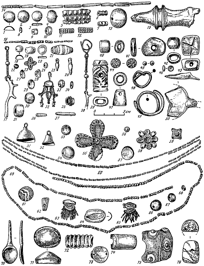 1 – позолоченная бронза; 2 – золото с гнездами для вставок из зеленоватых камней; 3 – медь с вставками камня; 4–6, 8, 32–34, 46, 47, 59, 60, 69 – бронза; 7 – серебро; 9, 13, 14, 16–18, 20–24, 26, 27, 35–41, 48–54, 56, 57, 62–65, 67, 68, 70–75 – поделочный и полудрагоценный камень различных пород: 9 – «черный камень», 13, 14 – бирюза, 16 – зеленоватая яшма, 17 – янтарь, 18 – «бледно-желтый» камень, 20–24 – сердолик, 26 – малахит, 27, 28, 39, 41, 52, 56, 65, 70, 72 – породы неизвестны, 35, 36, 53, 47 – глинистый известняк, 37, 38, 74 – серпентин, 40 – халцедон, 48 – белый меловой камень, 49–51, 57 – флюорит, 54 – глинистый сланец, 62–64, 68, 71 – гешир, 73 – красная яшма, кварцитовые породы, 75 – агат; 10, 19, 30, 31, 42–45, 55, 76 – кость; 11, 15 – раковина ужовка; 12 – стекло с позолотой; 25, 29 – многоцветное стекло; 58, 66 – железо; 61 – раковина каури.