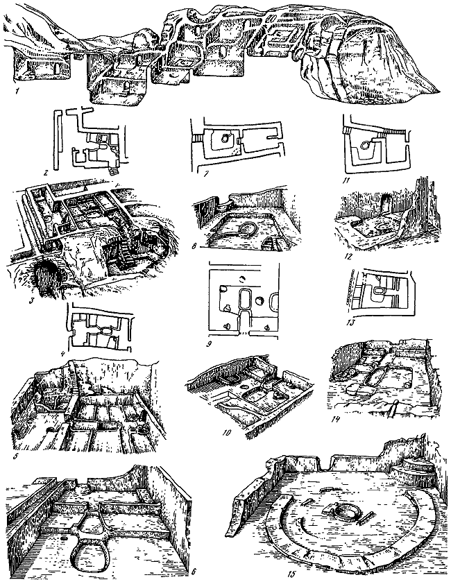 1 – вид с востока из центрального меридионального коридора; 2, 3 – план и общий вид жилой секции в раскопе 4 (помещения 1, 7, 14); 4, 5 – план и общий вид жилой секции в раскопе 4 (помещения 18, 25); 6 – общий вид части помещений жилой секции в раскопе 1 (помещения 42, 43), на переднем плане – центральный напольный очаг и суфа вдоль восточной стены помещения 42; 7, 8 – жилая секция в раскопе 1 (помещения 3, 10); 9, 10 – жилая секция в раскопе 1 (помещения 33, 34); 11, 12 – жилая секция в раскопе 4 (помещения 12, 3); 13, 14 – жилая секция в раскопе 1 (помещения 8, 14, 14а); 15 – общий вид «общественного» помещения 24 в раскопе 4.