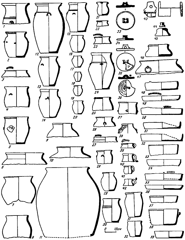 1–6, 8, 9, 12–15, 22, 23, 25–27, 36, 37, 42, 43, 45, 46, 57 – железо; 7, 16, 17, 30, 31, 38, 40, 41, 44, 47, 48, 59, 60 – кость; 10, 11, 18–21, 32–35, 49–52, 61, 62 – глина; 24 – железо, кость; 28, 53–56, 58 – бронза; 29, 39 – камень.