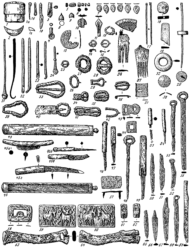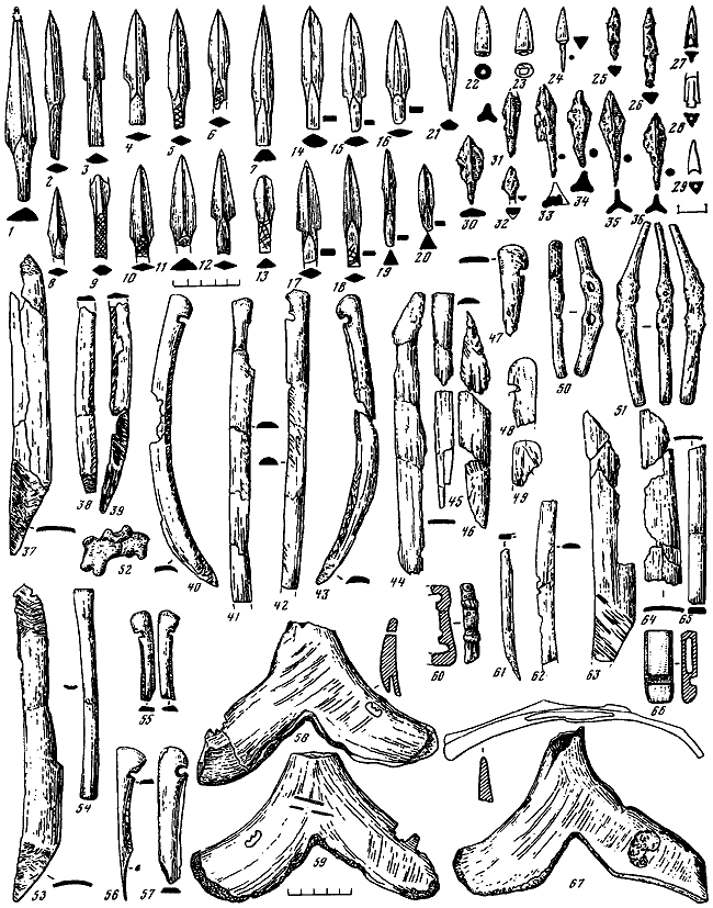 1-24, 37–50, 53–65, 67 – кость; 25, 26, 30–36 – железо; 27–29 – бронза; 51 – рог; 52 – глина; 66 – нефрит.