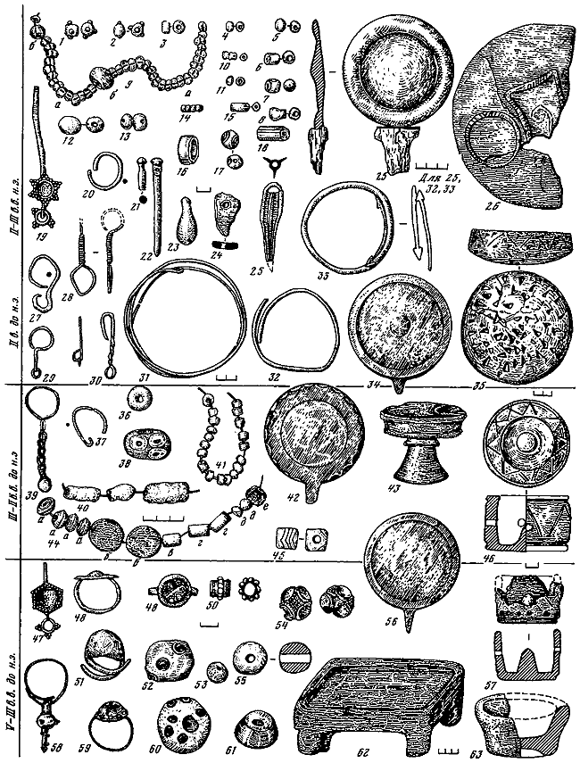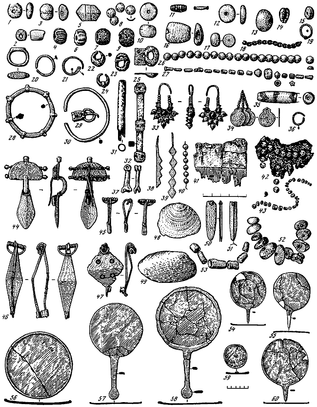 1–5 – стекло; 6, 34, 37, 41, 42 – золото; 7, 16, 26–28, 43, 46, 48, 49 – кость; 8, 9, 11, 12, 15, 17–24, 32, 33, 35, 36, 54, 62 – бронза; 10 – серебро; 13, 29–31, 38–40, 52, 55, 56 – глина; 14, 45 – тальк; 25, 47, 51, 58–61 – железо; 44, 50, 53, 57, 66 – камень; 63–65 – дерево.