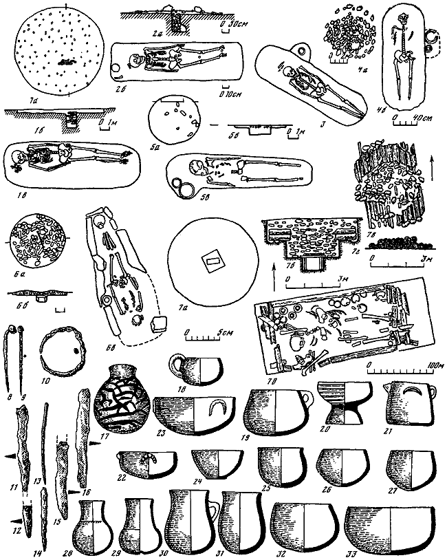 Таблица 30. Кенкольская культура. Тянь-Шань, Кетмень-Тюбе, Чаткал. Планы и разрезы курганов, погребений, могильный инвентарь.