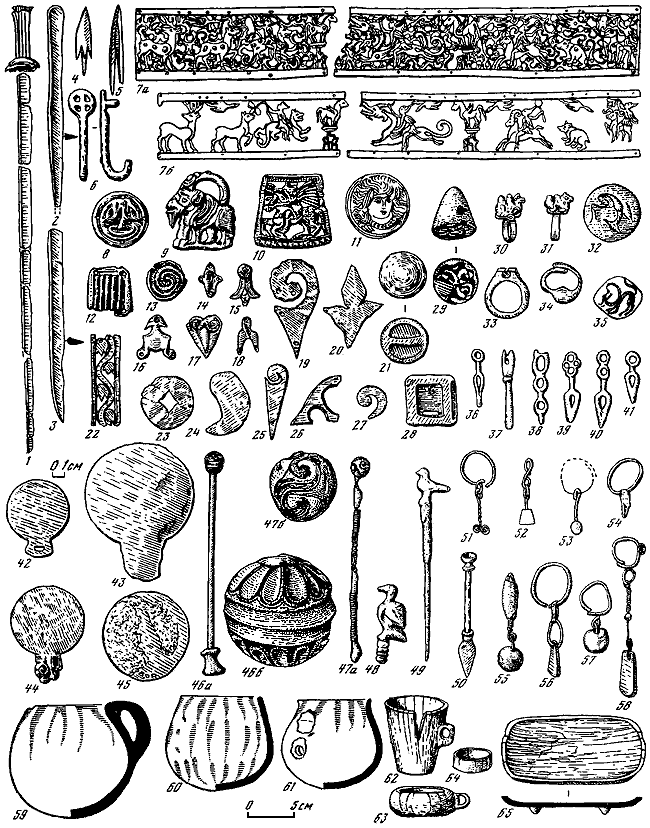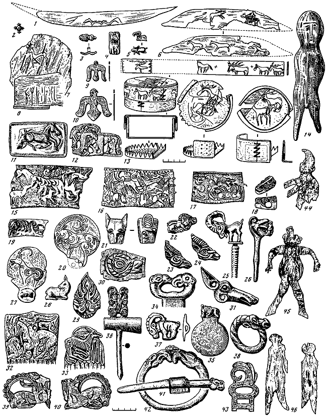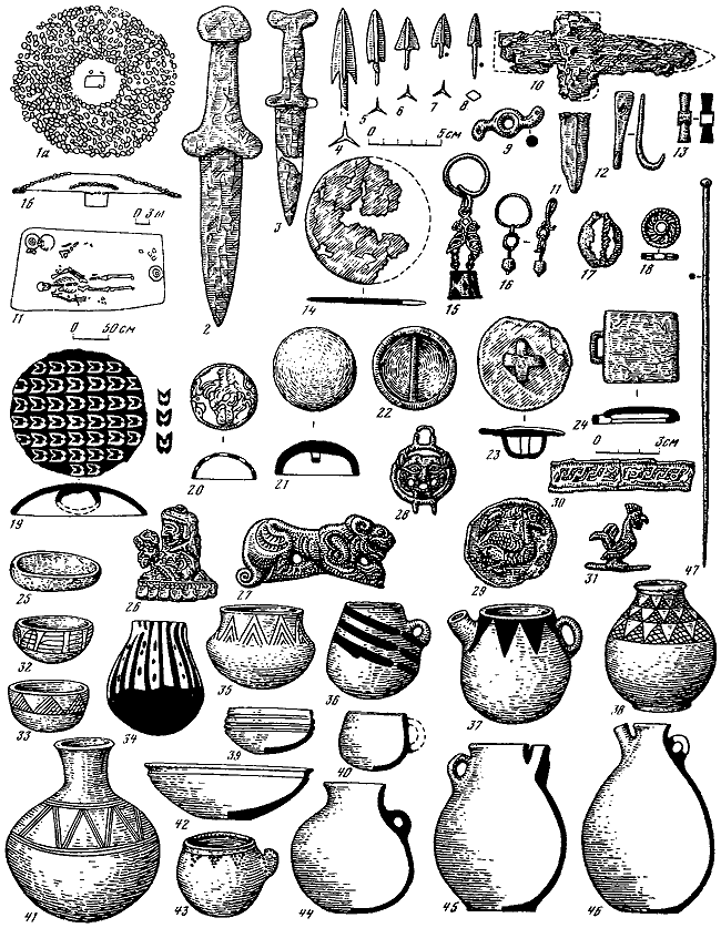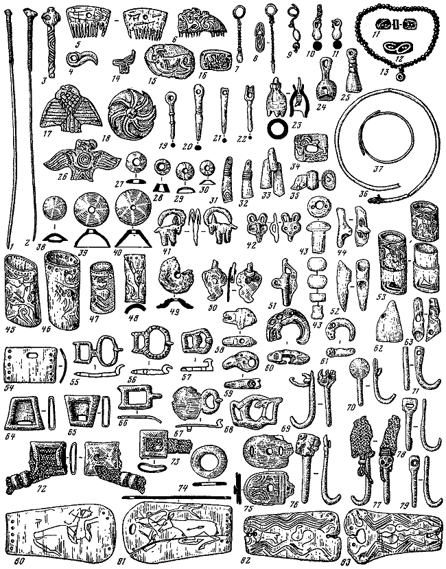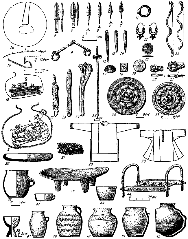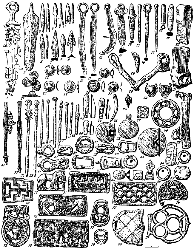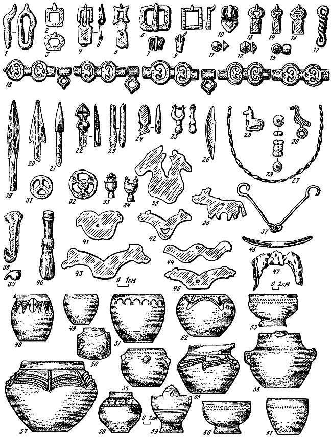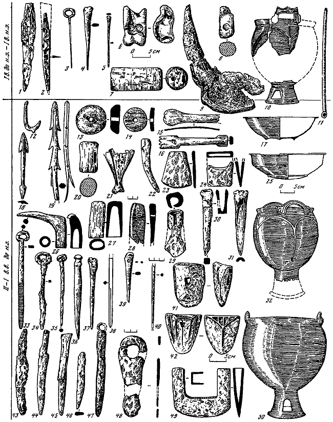 1–3, 12, 13, 17, 18, 30–38 – ножи; 4, 14 – наконечники стрел; 5 – накладка; 6 – удила; 7, 8 – псалии; 9, 22, 24, 25 – бляшки; 10, 11, 43 – котел, обломки котлов; 15 – бляшка в зверином стиле; 16 – поясная бляха; 19–21 – ложечковидные подвески; 23 – бусы; 26 – подвеска; 27, 29 – проволочные кольца; 28 – пряжка; 39–42 – кельты; 44 – зеркало.