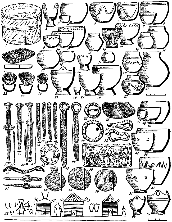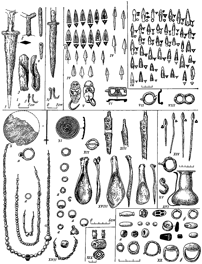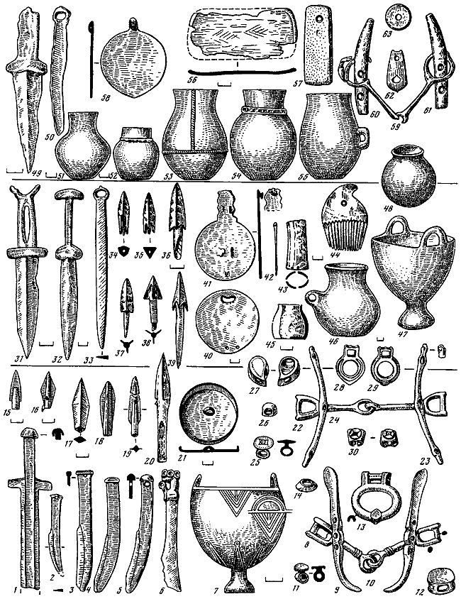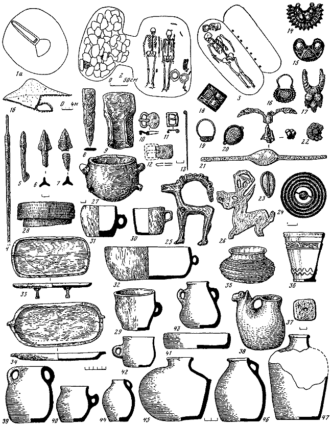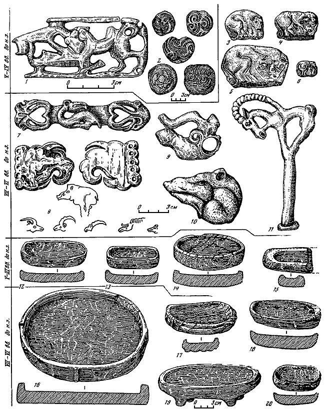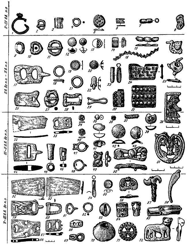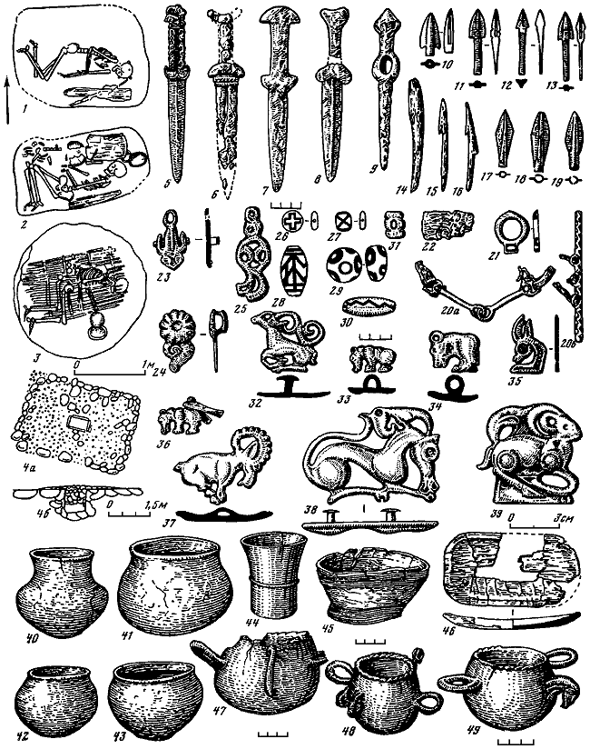 1–3, 12, 13, 17, 18, 30–38 – ножи; 4, 14 – наконечники стрел; 5 – накладка; 6 – удила; 7, 8 – псалии; 9, 22, 24, 25 – бляшки; 10, 11, 43 – котел, обломки котлов; 15 – бляшка в зверином стиле; 16 – поясная бляха; 19–21 – ложечковидные подвески; 23 – бусы; 26 – подвеска; 27, 29 – проволочные кольца; 28 – пряжка; 39–42 – кельты; 44 – зеркало.