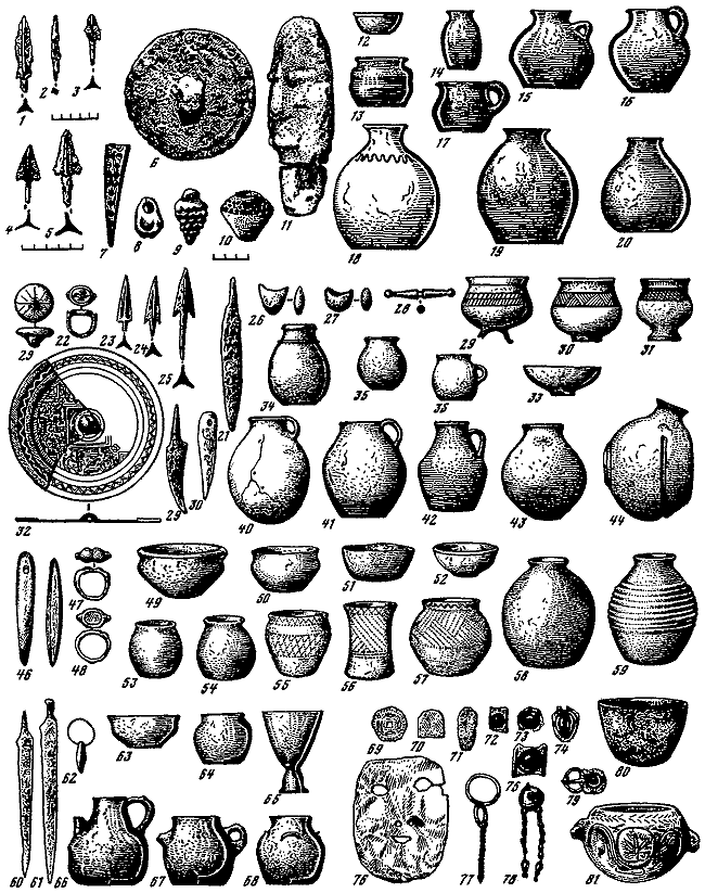 1–5, 21, 23–25, 29, 60, 61 – железо; 6, 22, 26–28, 32, 47, 48, 80 – бронза; 7, 8 – кость; 9 – египетский фаянс; 10, 12–20, 31, 33–44, 49–59, 63–68 – глина; 11 – алебастр; 30, 45, 46 – камень; 62 – бронза, стекло; 69–79 – золото; 81 – стекло.