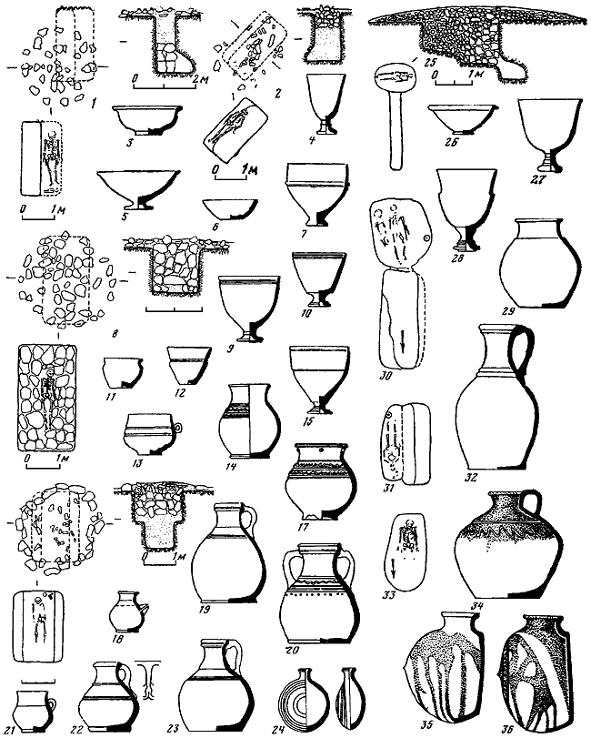 Таблица 36. Ранние кочевники Памира. Планы и разрезы курганов и погребений, могильный инвентарь.