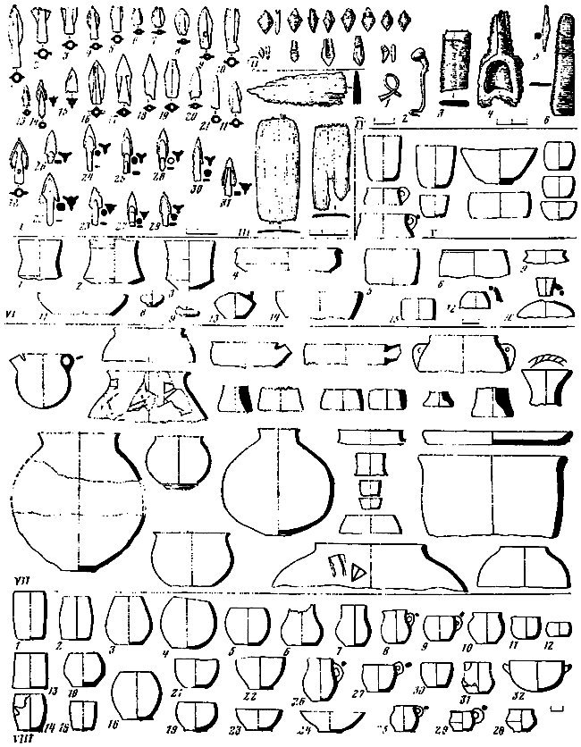 1–9 – планы поселений и жилищ саргатской культуры; (а – вал и ров; б – канавка; в – жилищная впадина; г – край обрыва; д – раскоп; е – дорога; ж – границы объектов на материке; з, и – то же на глубине 0,1 и 0,2 м от уровня материка; к – столбовая яма; л – очаг; м – ямы; н – прокал; о – зола; п – уголь; р – кости; с – песок; т – заполнение углубления пола жилища; у – дерн; ф – темно-серая супесь; х – позднейший прокоп; ц – пестроцвет; ч – обожженная глина); 10–33 – инвентарь памятников лесостепного Прииртышья VII–VI вв. до н. э.