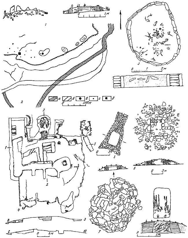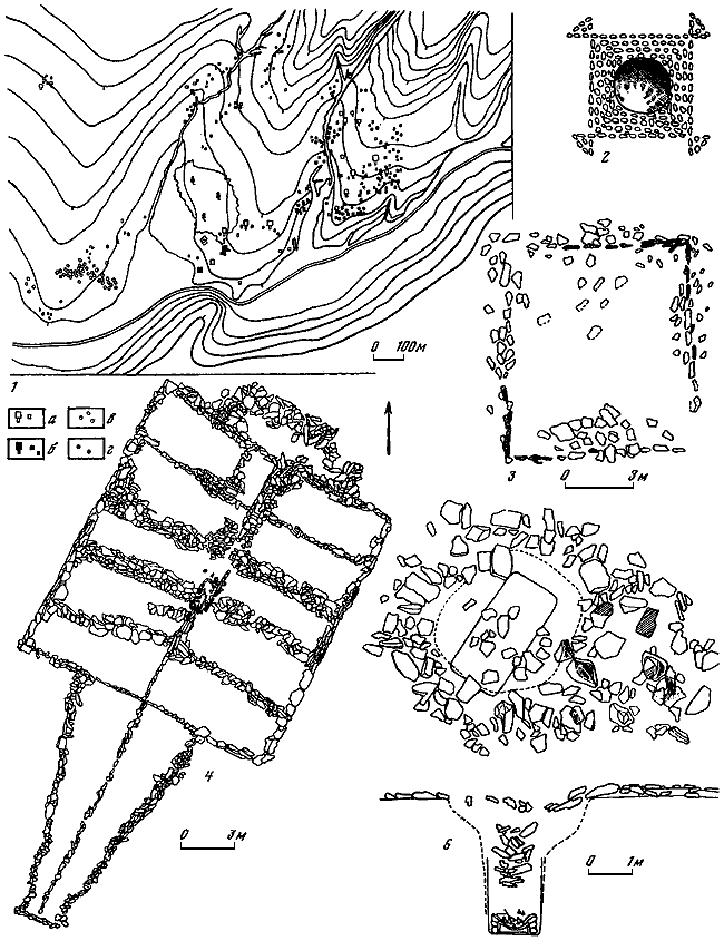 1–5 – Ильмовая падь: 1 – план могильника, 2–5 – планы и разрезы намогильных сооружений суджинского типа.