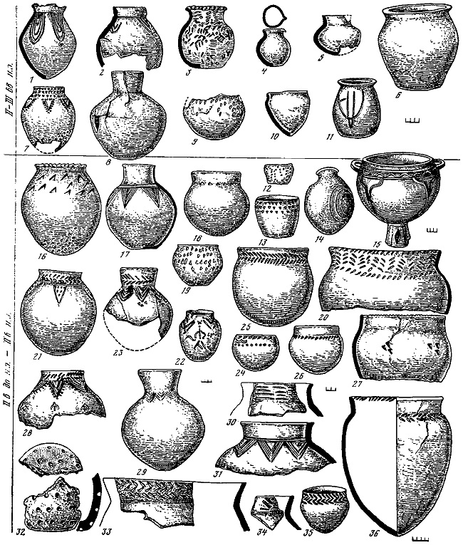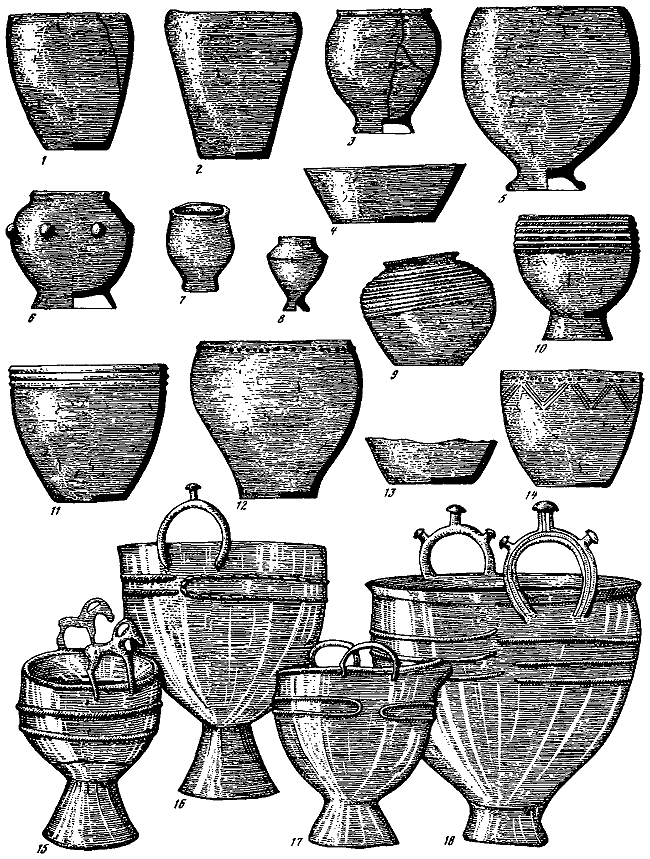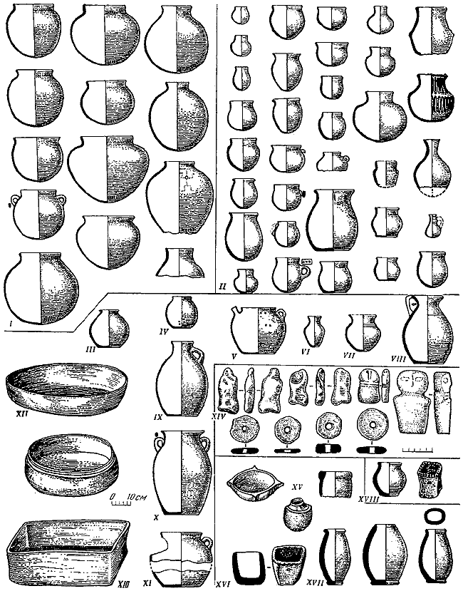 Таблица 120. Гороховская культура. Сосуды из глины, меди и кости.
