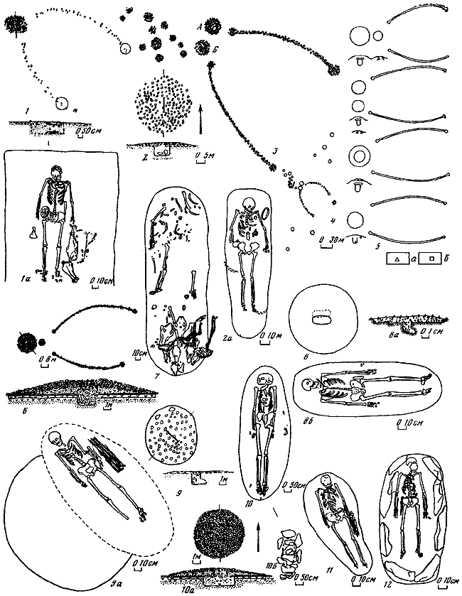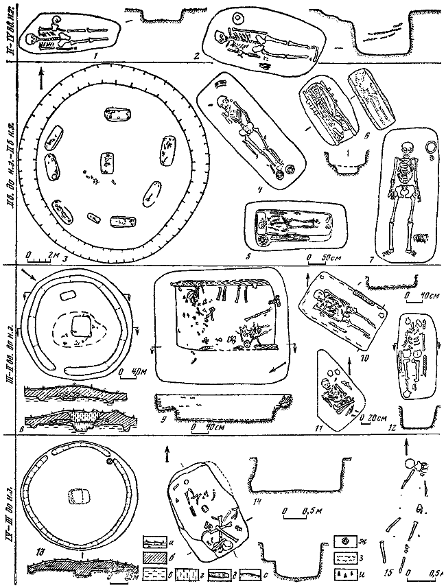 1–4 – планы городищ (а – вал и ров; б – жилищная впадина; в – раскоп; г – дорога; д – неопределенные углубления; е – лес); 5, 7 – планы жилищ (а – очаг; б – углистые полосы; в – столбовые ямы; г – земля с размокшим углем; д – яма; е – следы досок; ж – фрагменты керамики; з – скопление костей; и – зола; к – обгорелые бревна; л – глина); 6, 8, 9, 11–14 – планы погребений; 10, 15 – планы курганов (а – дерн; б – заполнение грабительского прокопа; в – береста и органические остатки; г – камни; д – чернозем насыпи; е – погребенная почва; ж – материк).