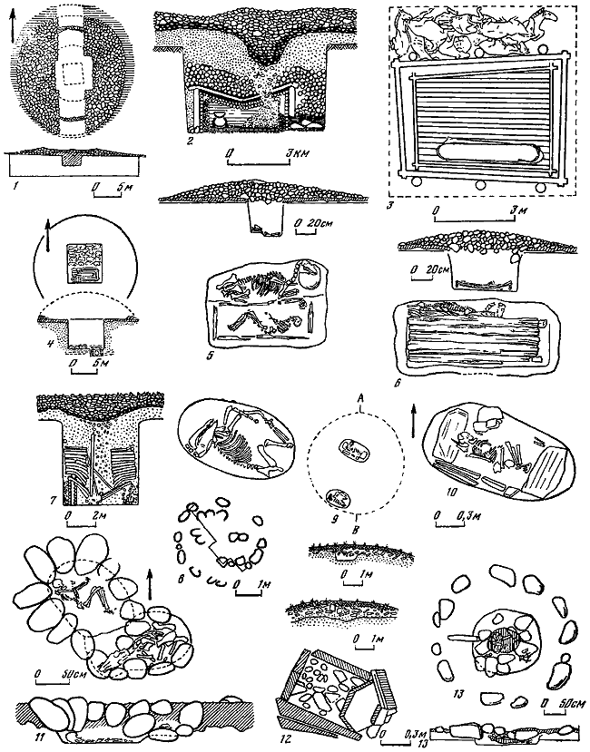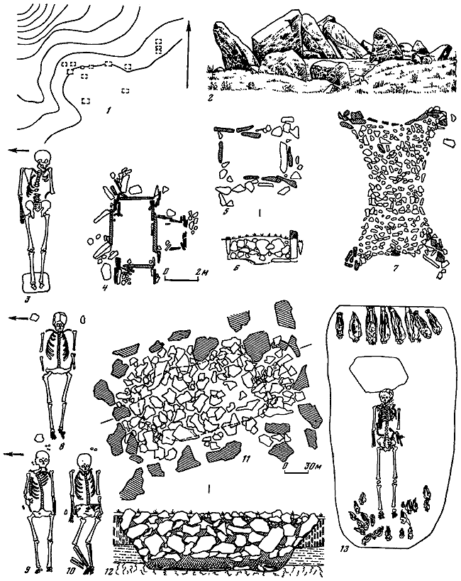 1 – план могильника Саянтуй; 2 – вид могилы 10 могильника Саянтуй; 3 – положение костяка в могильнике Убур-Билютай; 4 – план плиточной могилы 63 у горы Тапхар; 5, 6 – план и разрез плиточной могилы 10 могильника Саянтуй; 7 – план «фигурной» плиточной могилы 113 могильника Сосновая падь; 8-10 – положение костяков в плиточных могилах у станции Оловянная; 11–13 – планы и разрез могилы 10 могильника Дарасун 3.