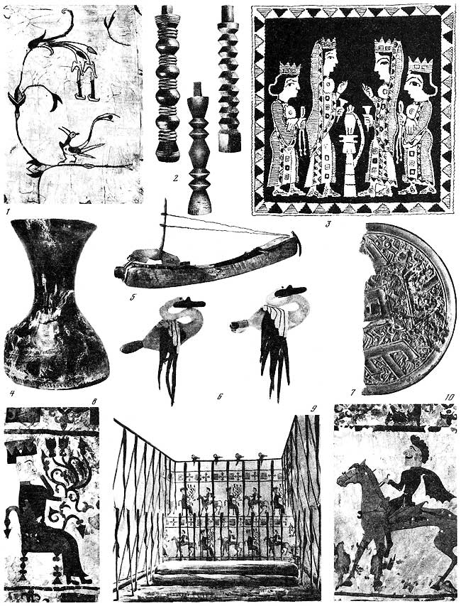 1 – план культового комплекса Бабиш-Мулла 6; 2 – деревянные погребальные носилки из мавзолея Асар; 3 – Баланды 4; 4–6 – деревянные сосуды, корзина из мавзолея Асар; 7 – план заполнения мавзолея Асар.