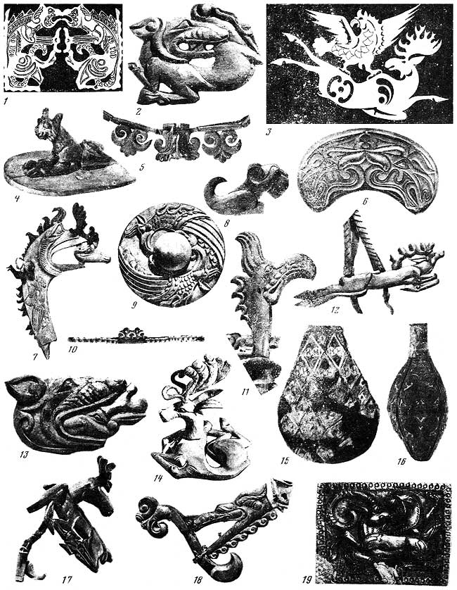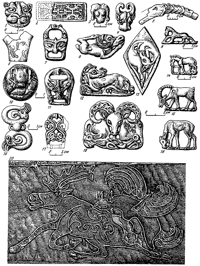 1, 3, 4, 7-19 – бронза; 2, 5, 6 – кость; 20 – деталь вышивки на войлочном ковре.