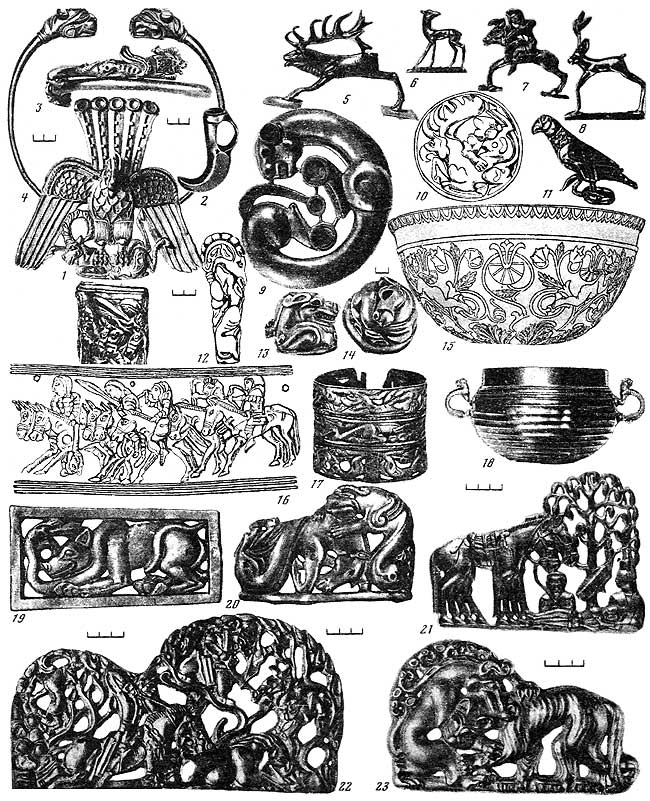 Одно из самых значительных археологических открытий Сибири – классические по методике раскопки М.П. Грязновым кургана Аржан – поразительного памятника скифской культуры VIII в. до н. э. Погребальный обряд и инвентарь кургана заставил исследователей вновь вернуться ко многим проблемам скифской археологии, особенно к проблемам периодизации и сложения скифского археологического комплекса. Анализ материалов памятника, предпринятый М.П. Грязновым (1980), исследование типологического характера всей конской узды Аржана, проведенное Н.А. Боковенко (1986), а также дендрохронологические исследования образцов дерева (Марсадолов Л.С., 1985) позволили датировать комплекс Аржана VIII в. до н. э., может быть, его второй половиной или концом, как представляется многим археологам (А.М. Мандельштам, А.И. Мелюкова, В.П. Петренко). Хронологически он поставлен в один ряд с памятниками новочеркасско-черногоровского типа. Но Аржан содержит уже полностью сложившуюся «скифскую триаду», которая в Северном Причерноморье не может быть датирована временем ранее середины VII в. до н. э. Очень важно также, что в зверином стиле Аржана представлены практически все образцы скифского искусства, выполненные различной техникой и на различных предметах: выбивка, резные изображения (оленные камни), мелкая пластика (головка коня), барельеф (нагрудная бляха), скульптура (бронзовые навершия), резьба по кости (кабан на клыке). Нет, правда, еще сцен терзания, которые появляются позже.