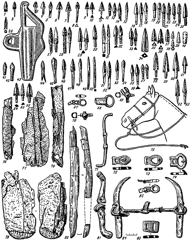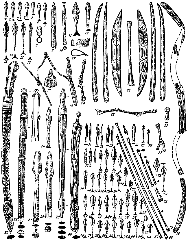 1–5, 12–17, 19–23, 25–28, 31, 39, 41–43, 47, 48, 59, 75 – железо; 6–8, 11, 18, 24, 30, 32–37, 40, 44, 49–53, 58, 60–65, 74 – кость; 9, 38, 54, 55, 66–73 – бронза (66, 68 – черешки железные); 10, 45, 46, 56, 57 – бронза, кожа; 29 – железо, кожа.