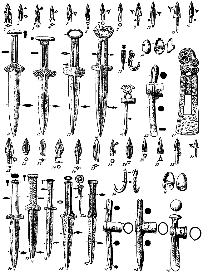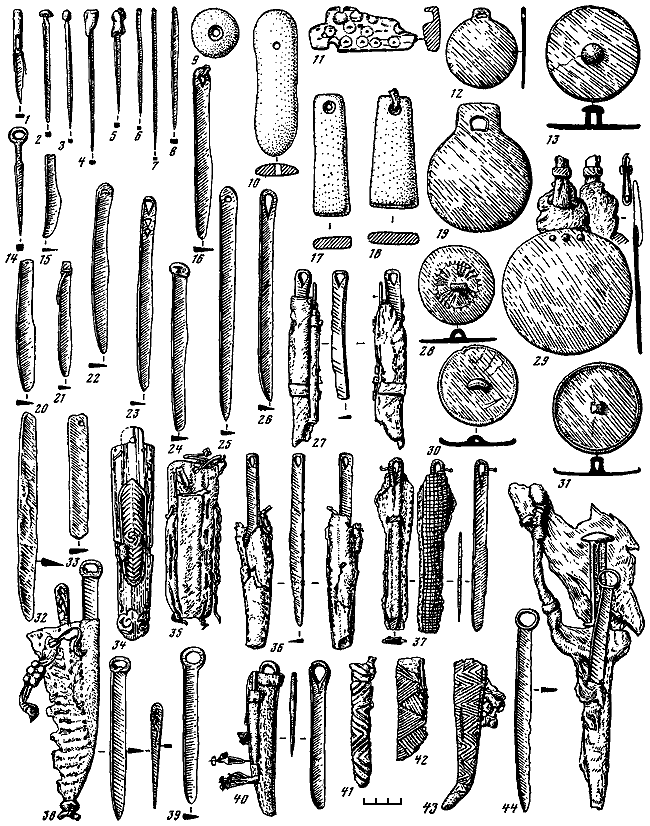 1–6, 8-13, 15–22, 24–44 – бронза; 7 – рог; 14 – кость; 23 – камень.