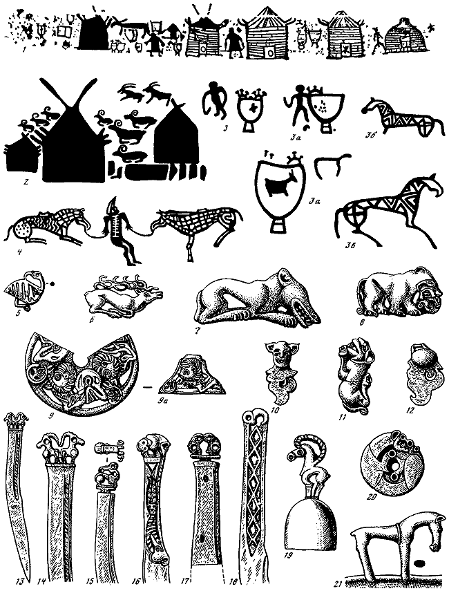 Деревянные, кожаные и войлочные изделия, дошедшие до нас почти в первозданном виде (что никогда не встречается при обычном состоянии захоронения) и являющиеся непревзойденными образцами скифо-сибирского звериного стиля, демонстрируют, с одной стороны, очень высокий уровень эстетического развития и мастерства алтайских племен, а с другой – представляют собой исключительный источник для изучения мифологического творчества и религиозных представлений населения Алтая. Бесспорным доказательством местного производства всех этих изделий служит татуировка, сохранившаяся на теле вождя из Пазырыкского II кургана. Она представляла собой сложное сюжетное изображение, выполненное в образах звериного стиля. Поскольку о существовании обычая татуировки, которая у большинства народов обозначала благородное происхождение и знатность, имеются неоднократные сообщения в письменных источниках (Помпоний Мела – об агафирсах; Аммиан Марцелин – о даках и сарматах), открытие ее на теле погребенного в Пазырыке особенно ценно. Это еще один пример, когда археологические данные подтверждают и раскрывают скудные сообщения древних авторов. Духовную культуру населения Алтая характеризуют и находки двух четырехструнных арф и двух тамбуринов в Пазырыкских курганах.