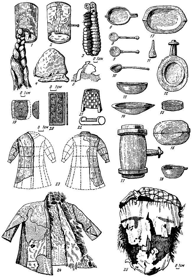 3, 4, 16, 24 – кость; 5-10, 20, 21 – железо; 11, 12, 26, 27 – бронза; 13, 14, 17–19, 23 – камень; 15 – золото; 25 – дерево, глина (веретено); 22, 28, 29 – реконструкция; 30–35 – дерево; 36–42 – глина.
