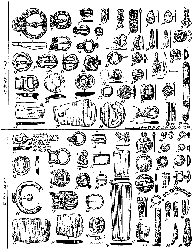 1 – железо, дерево; 2, 3, 12, 22–24, 29, 30, 33–35, 43, 44, 46–49 – железо; 4–8, 11, 13, 15, 16, 18–21, 26, 27, 31, 36–40 – кость; 9 – дерево; 10, 17, 25, 32, 50 – бронза; 14 – глина; 28 – камень, сланец; 41, 42 – чугун; 45 – железо, кость.