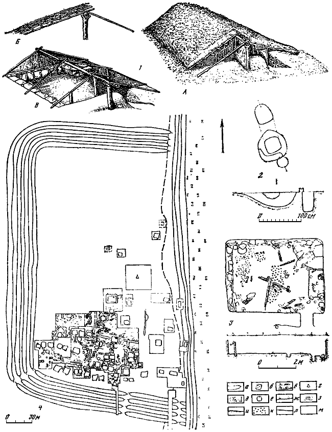 а – вал; б – жилища; в – дерево; г – местоположение сыродутного горна; д – камни; е – хозяйственные ямы; ж – дерн; з – раскопы Г.П. Сосновского; и – материк; к – горелая солома; л – глиняная обмазка; м – пойма р. Селенга.