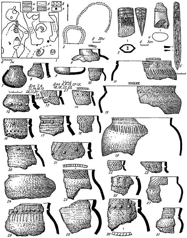 1 – планы жилищ 1, 2 (а – очертания остатков сооружений; б – предполагаемые очертания; в – уголь; г – прокаленный и спекшийся с золой песок; д – заполнение поздней ямы; е – ямки от столбов); 2 – план поселения (валы от памятника воробьевского типа); 3-31 – инвентарь.