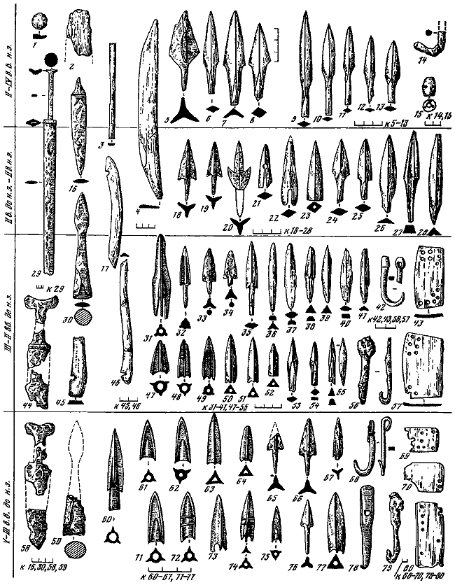 1–5, 8, 12–15, 19–24, 26, 27, 33–35, 39, 47, 57, 60, 64 – железо; 6, 7; 16–18, 25, 28–32, 36–38, 41, 42, 48, 52, 59, 61, 68, 71, 73–75, 77–79, 80 – кость, рог; 9 – перламутр (раковина); 10, 40, 63 – камень: 10 – зеленоватая яшма, 40 – зеленоватый камень, 63 – липаритовая лава; 11, 43, 44, 46, 49–51, 53–56, 58, 62, 65–67, 69, 70, 72, 76, 81 – бронза; 45 – бронза, железо (язычок).