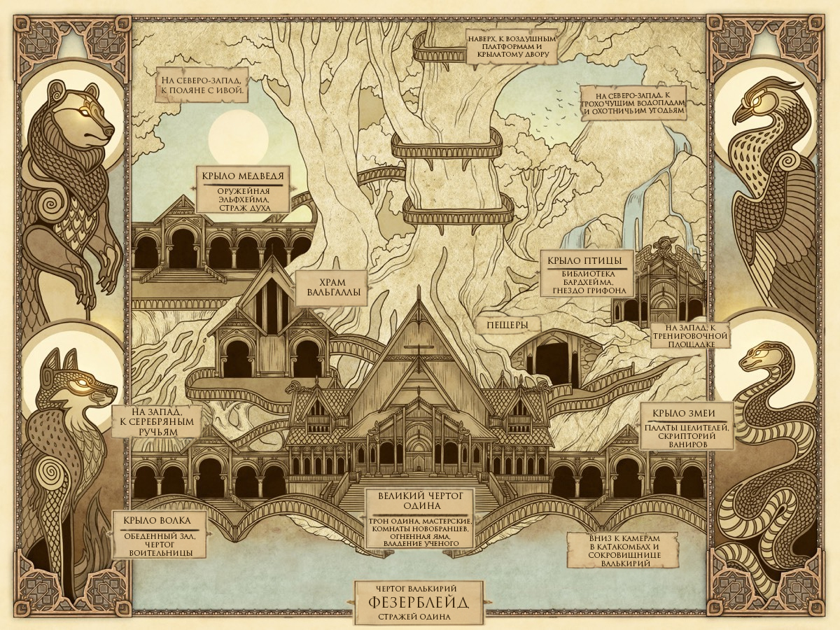 Иггдрасиль – древо жизни, а также общепринятое название мира пяти Дворов, которые соединены со стволом корнями – реками.
