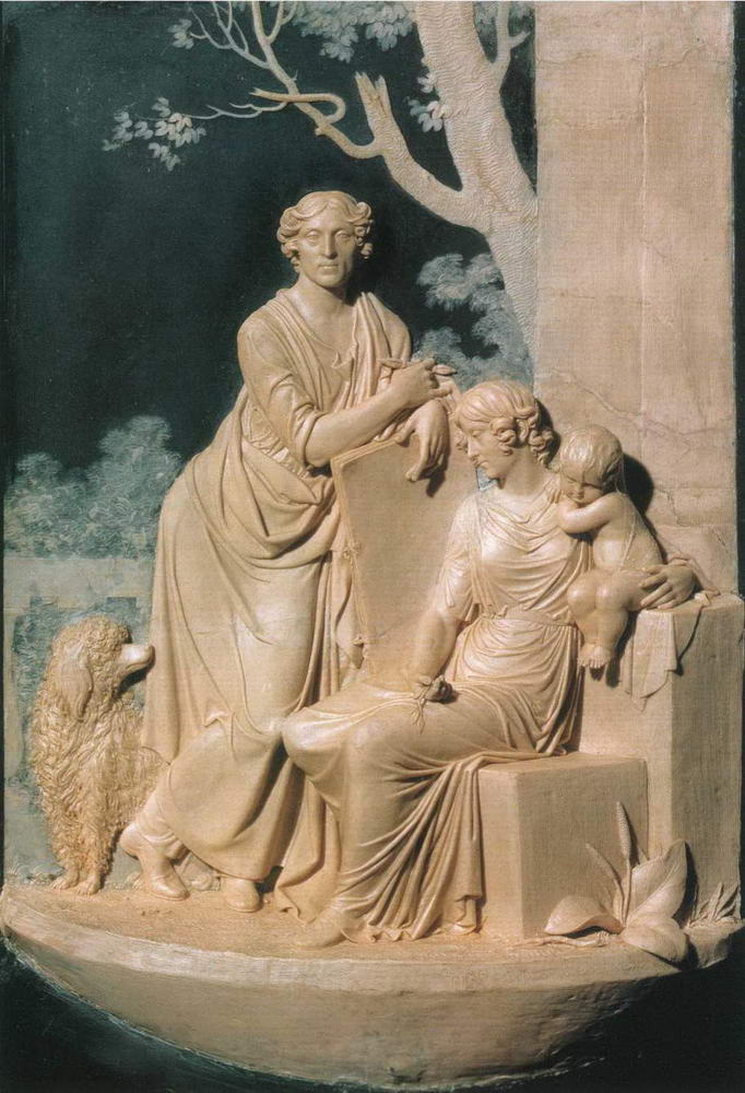 Граф Федор Толстой предстал в портрете художником и скульптором. Его полный непринужденности облик исполнен чувства собственного достоинства. Рядом с ним те, кто ему дороги, – любимая жена Анна Федоровна и «небесная радость», дочь Лиза. Пластическое решение барельефа, гибкость плавных линий, обрисовывающих фигуры, изящество складок античных одежд, сквозь которые проступает совершенство форм, чувство гармонии рождены еще одной любовью Толстого – античной культурой. Величавая торжественность барельефа пронизана и идиллической безмятежностью, и той долей чувствительности, которые связывают мироощущение Толстого с сентиментализмом. Искренность и простодушная непосредственность (даже парадный портрет, своеобразный итог прожитых лет, не избежал ни любимого Гектора, ни листьев подорожника) стали обязательной составляющей будущих художественных образов мастера.