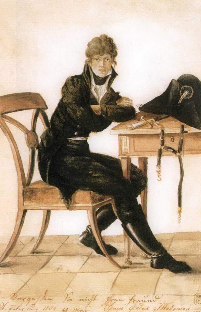 В карандашном Автопортрете (1810) самый молодой почетный член Академии предстал с увлечением и прилежно работающим. Влюбленный в искусство Древней Греции, он не прочь был примерить и плащ романтического героя, простодушно представив в Автопортрете с пуделем рядом с собой любимца Гектора.