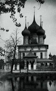 Далеко на запад, за городской чертой, за оврагом Паутовцем, у небольшой речки, впадавшей в Которосль, в 1670–1678 гг. была выстроена церковь Владимирской богоматери (угол Мышкинской и Рыбинской улиц). Суровый облик этого храма, почти лишенного декоративного убранства фасадов, соответствовал его местоположению на божедомке – месте общего захоронения неимущих. Его три невысоких шатра, поставленные по оси север – юг над главным прямоугольным объемом, – последний отзвук некогда распространенной в ярославском зодчестве формы завершения.