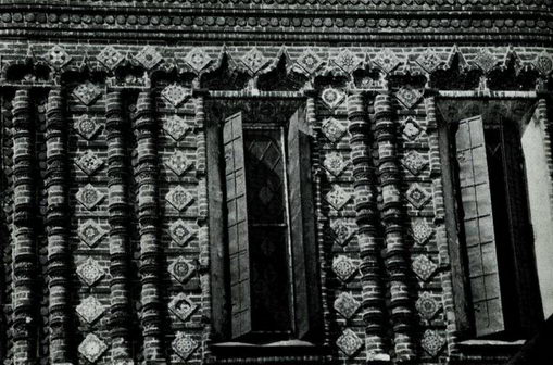 На остальных фасадах росписи располагаются в виде небольших вкраплений на откосах окон, фронтонах крылец, дверях, оконных ставнях. Эти живописные вставки дополняют и усиливают впечатление огромной нарядности тех частей фасадов, которые доступны ближнему обозрению? Однако главным декоративным материалом стал здесь лекальный фигурный кирпич. В церкви Иоанна Предтечи он впервые полностью заменил тесаный. Формы и размеры его варьируются от простого валика до крупных, пышно орнаментированных блоков. В рисунке наиболее сложных образцов проступают мотивы древней деревянной домовой резьбы (илл. 81).