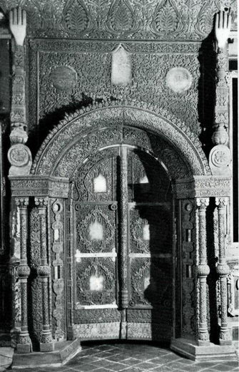 В полутьме северного Казанского придела мерцают резные царские врата древнего иконостаса (илл. 93). Тончайшее кружево резьбы вьется по цветному фону. Орнамент, то более сочный и рельефный (в широком верхнем карнизе), то мелкий и Дробный (на узких колонках внизу), не только подчинен, но даже подчеркивает формы этого сложного архитектурного сооружения.