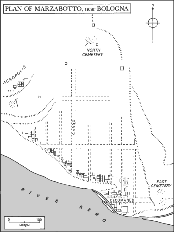 При строительстве Марцаботто была использована решетчатая планировка улиц. Этот этрусский колониальный город находился примерно в 25 километрах к югу от Болоньи, в долине Рено. История города была короткой. Впервые это место было заселено приблизительно в 500 году до н. э.; в IV веке его разграбили галлы, и от их набега город так и не оправился. Раскопки в Марцаботто начались в XIX веке, к настоящему времени открыта уже большая часть города.