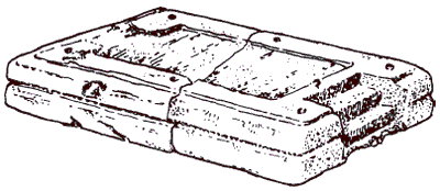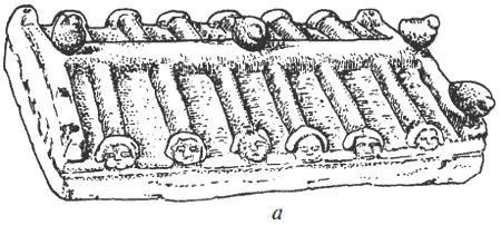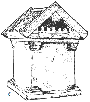 Рис. 16. а –крышка каменного саркофага, показывающая расположение черепицы и антефиксов; б –терракотовый саркофаг, показывающий расположение балок.