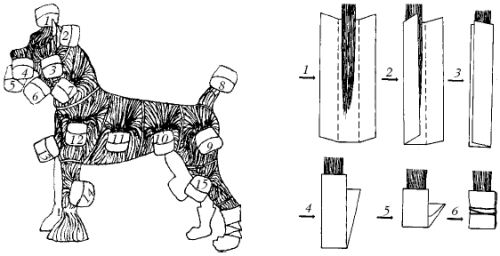 К возрасту 9-10 месяцев можно приступать к накручиванию шерсти на корпусе. Длина папильоток должна соответствовать длине шерсти животного. Средний размер приблизительно равен сложенному вдвое машинописному листу.