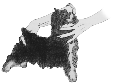 Необходимо с первых дней пребывания щенка в доме приучать его к стойке. Сначала поставьте щенка к себе на колени так, чтобы передние ноги опирались на правое колено, а правой рукой поддерживайте его за голову. Опорой для задних ног будет ваше левое колено. Левой рукой поддерживайте щенка под хвост.
