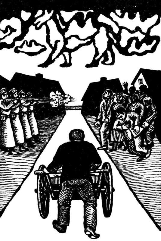 Мужчины взяли из рук Ионаса тележку, чтобы везти раненых. Ионасу пришлось взвалить тушу себе на спину. Он не мог поступить иначе, потому что уже в утробе матери к его ногам были привязаны путы. Так, спотыкаясь, побрел он обратно к трактиру, неся на спине свиную тушу. Ионас судорожно держался за окоченевшие свиные ноги; свинью, выращенную другими людьми, он не смел кинуть в сточную канаву.