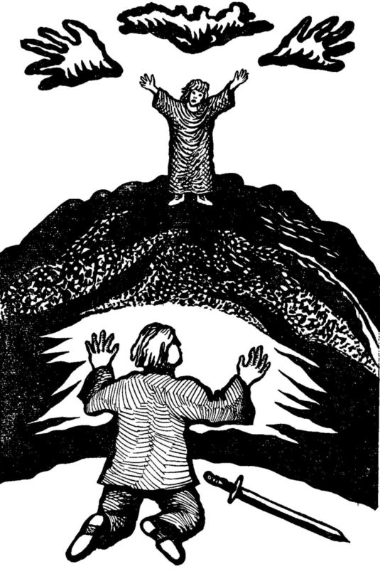 Неожиданно дух появился на гребне горы. Чуточку переведя дыхание, он возвестил о том, о чем и должен был возвестить. Принц стоял у подножья и простирал руки к духу своего отца. Он двинул ногой, обвалившийся сверху пласт золы почти по колено завалил его серым пеплом.