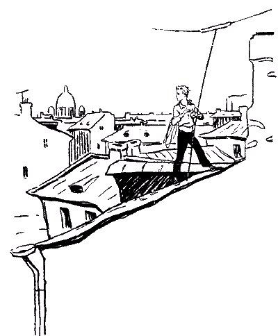 Игорь отступил на шаг, чтобы полюбоваться своей работой, и в ту же секунду почувствовал, что крыша уходит у него из-под ног. Мелькнула мысль: мандариновая корка! Он забалансировал, но не удержался, шлепнулся на железо, на мгновенье повис над узкой щелью между двумя домами, цепко ухватившись за край крыши. Пустота медленно тянула его вниз. Он напряг все тело, изогнулся и, охнув от боли, уперся ногами и руками в одну стену, спиной – в противоположную.