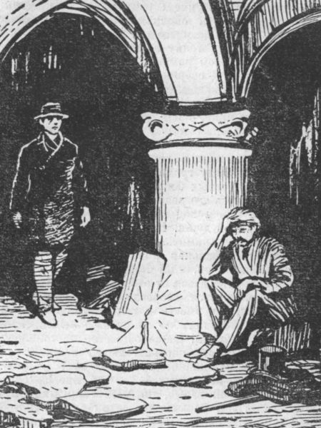 Он стоял на небольшой узкой площадке, откуда крутая лестница уходила во мрак подземелья. Пьер начал спускаться в темноту, осторожно переставляя ноги, чтобы не шуметь. Придерживаясь рукой за стенку, он медленно продвигался, как бы погружаясь в колодец. Спуск оказался не очень долгим. Коснувшись ногой твердой почвы, Пьер остановился, он не решался двигаться дальше, опасаясь выдать себя. Вокруг было черным-черно. Гнетущая тишина, ни звука, ни шороха. Куда идти дальше? В какую сторону? Он стоял в нерешительности; но вот шагах в двадцати от него вспыхнул свет – загорелась спичка. Это был Гильом, он зажег свечу. Пьер сразу узнал его по широким плечам, и ему оставалось только следовать за огоньком по сводчатому подземному коридору, облицованному плитами. Он казался бесконечным и, по-видимому, вел в северном направлении, проходя под центром собора.