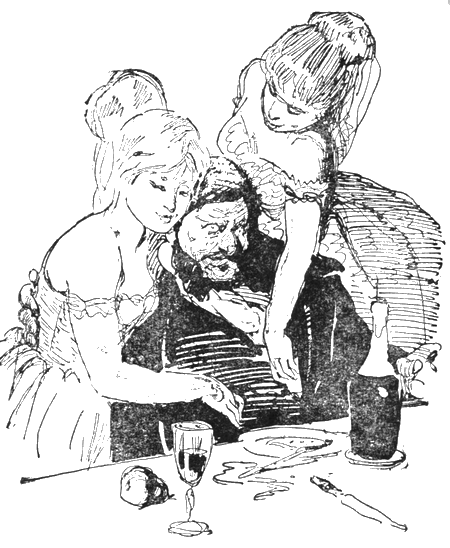 Тут Ортанс и Берта, уже не стесняясь, бросились к дядюшке. Страстное желание заполучить двадцать франков, сдерживаемое вначале их благовоспитанностью, наконец довело девиц до бешенства, и они забыли всякие правила приличия. Одна из них запустила обе руки в карманы дядюшкиной жилетки, в то время как другая шарила в карманах сюртука. Дядюшка, откинувшись назад, еще кое-как отбивался. Но вдруг на него напал прерываемый пьяной икотой смех.