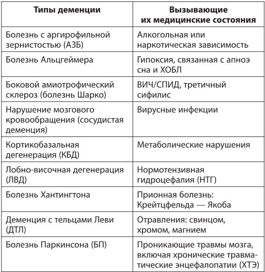 Реальность же состоит в том, что в широком смысле деменция провоцируется множественными состояниями и процессами, обнаруживаемыми с частотой 75–80 % от всех аутопсий у пациентов с первичным диагнозом одного из множества нейродегенеративных заболеваний. Современный уровень методов молекулярной генетики и использования биомаркеров дает возможность точнее устанавливать наложение и сходство в механизмах различных патологий. Здесь для сведения мы приводим список наиболее часто встречающихся вариантов деменции и провоцирующих их медицинских состояний.