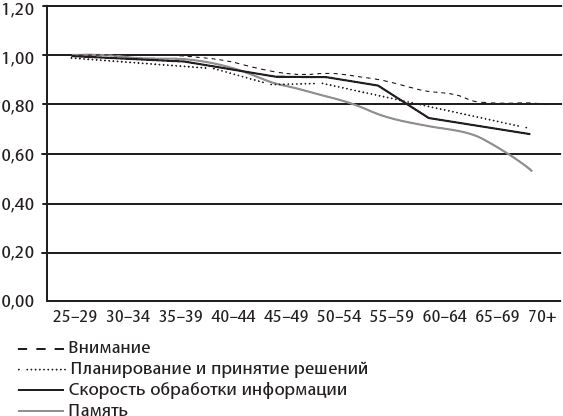 Обратите внимание, как падают кривые по мере увеличения возраста. В сравнении с нашими умственными способностями на исходе третьего десятка различные когнитивные функции понижаются не более чем на 20 % (внимание) и 45 % (память) на протяжении последующих 50 лет. Показатели одних функций понижаются более плавно, других – более резко, но среднее число для любого использованного нами теста было обязательно выше в 25 лет, чем в 75.