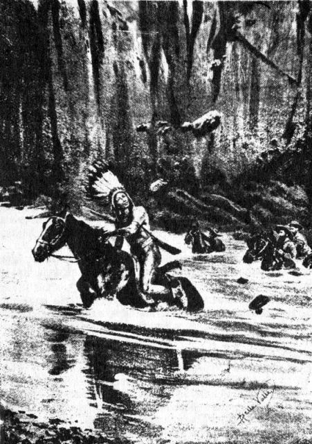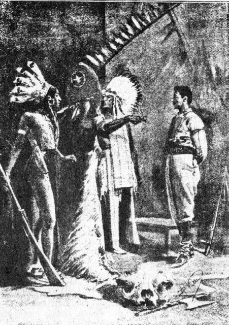 – Стойте! Перед вами вождь Красный Мокасин! Увидев довольно-таки внушительную фигуру экс-бандита, краснокожие остановились, но держали в руках ружья, готовясь стрелять при первом подозрительном движении. Потом из их рядов выдвинулся высокий и мускулистый индеец, над головой которого развевались два пера черного сокола. Сделав несколько шагов, он остановился и крикнул: