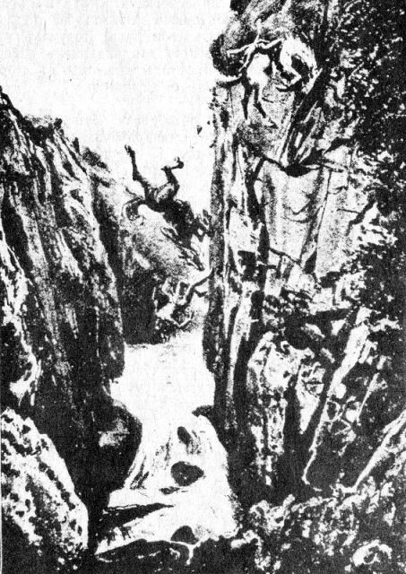 Оба краснокожих, ничего не подозревая, беззаботно ехали почти по самому краю пропасти. Один дремал на ходу, другой мурлыкал какую-то песенку. И вдруг две огненные линии прорезали воздух, два выстрела слились в один. Лошади индейцев взвились на дыбы и рухнули со страшной высоты в пропасть, увлекая за собой безжизненные тела всадников. Минуту спустя все «пленники» Сэнди Гука были на свободе и поторопились вооружиться. Лорд Вильмор не отстал от товарищей и с серьезным видом завладел своим карабином.