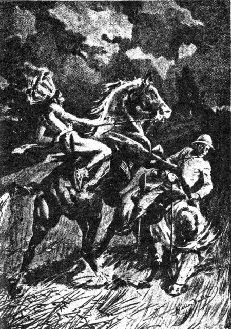 Взбешенный нелепым сопротивлением эксцентричного англичанина, экс-бандит неожиданно поднял свою лошадь на дыбы, а потом дал ей шпоры. Лошадь рванулась и грудью сбила с ног коня лорда Вильмора. Но англичанин не растерялся, и Сэнди Гук, к своему удивлению, увидел его сейчас же в полной готовности дать отпор хотя бы при помощи кулаков. Тогда американец в свою очередь соскочил с седла.