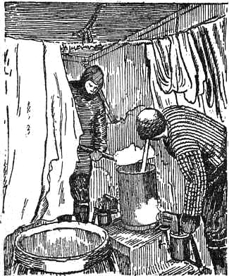 «Мы собираемся вокруг огня, сидя на ящиках. Каждый держит в руках большой кусок хлеба с маслом и жестяную кружку с чаем: тепло, уютно, хорошо! Однако, в доме мы остаемся недолго. Мы спешим на работу и возвращаемся часам к пяти-шести с изрядным аппетитом. А в это время наши кулинары хлопочут над приготовлением вкусной жареной тюленьей печенки. Удивительно, как это блюдо не надоедает нам, и каждый вечер мы расхваливаем его. Впрочем, один раз оно оказалось неудачным. Уильсон, всегда проявлявший большую изобретательность в деле приготовления разных кушаний, едва не погубил своей репутации. Он вздумал жарить тюленью печенку в пингвиновом жире, уверяя, что этот жир можно лишить его неприятного вкуса. Достали жир, тщательно перетопили его. Получился прозрачный, чистый и лишенный всякого запаха жир. Но наружность, как известно, бывает обманчива, и наше кушанье оказалось пропитанным тем особым ароматом, которым отличается мясо этой птицы и о котором лучше не распространяться. Трое из нас оказались героями и все-таки одолели свои порции, но остальные, отведав, решили довольствоваться сухарями с какао».