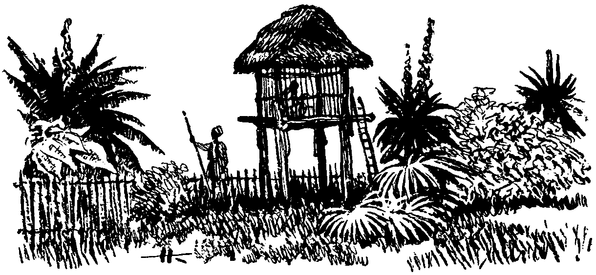Бамбуковая клетка на высоких подпорках, безоблачное небо над сквозным переплётом крыши, туземная стража внизу. Каждое утро и каждый вечер в тюрьму приходили на проверку.